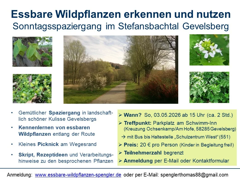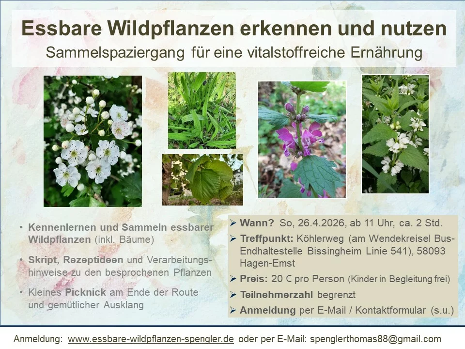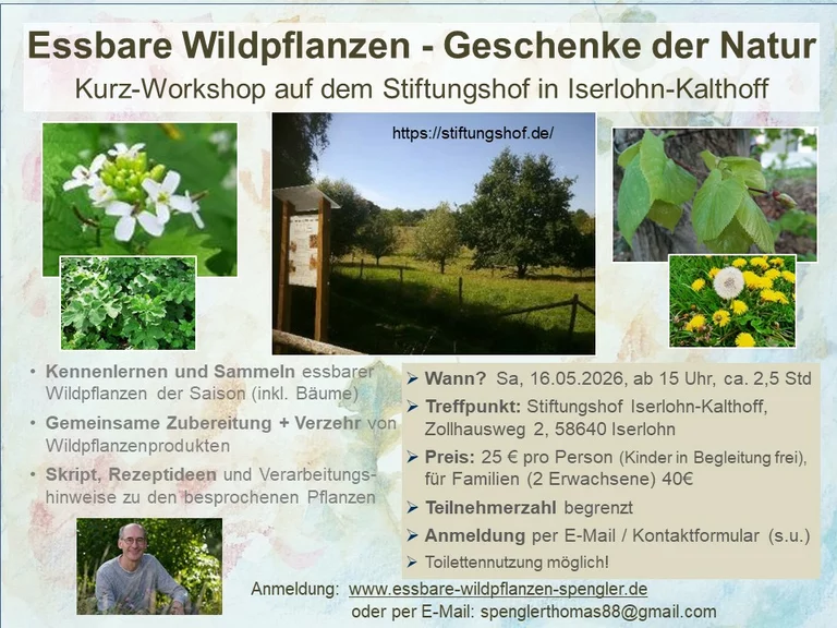 Am Sa, 16. Mai 2026 ab 15 Uhr veranstalte ich auf dem Stiftungshof in Iserlohn-Kalthof einen Kurz-Workshop zu essbaren Wildpflanzen auf dem Hofgelände und darum herum.