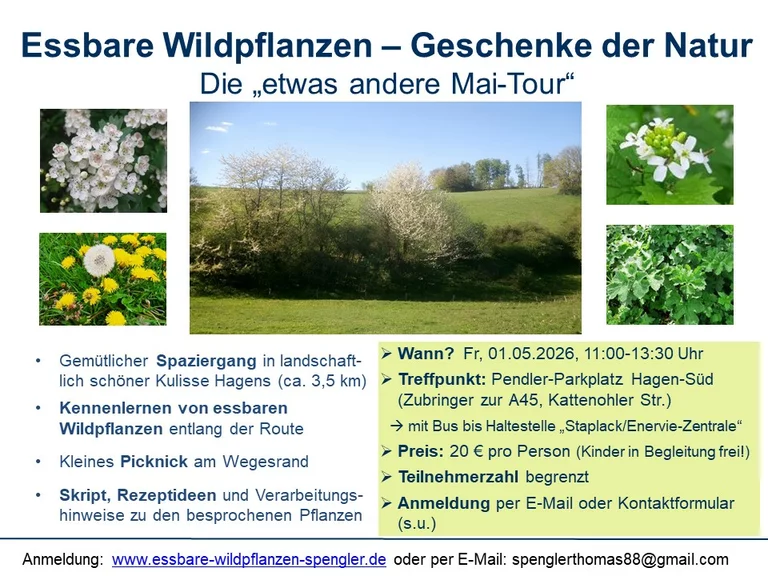Am Fr, den 1. Mai 2026 startet wieder die "etwas andere Maitour" im Hagener Süden (58093 Hagen). Neben einer schönen und abwechslungsreichen Kulisse erwartet dich ein breiter Mix aus essbaren Wildpflanzen zum Kennenlernen und Probieren, viele Geschichten und Hintergründe zu den Pflanzen auf der Wegstrecke und ein Picknick unterwegs.