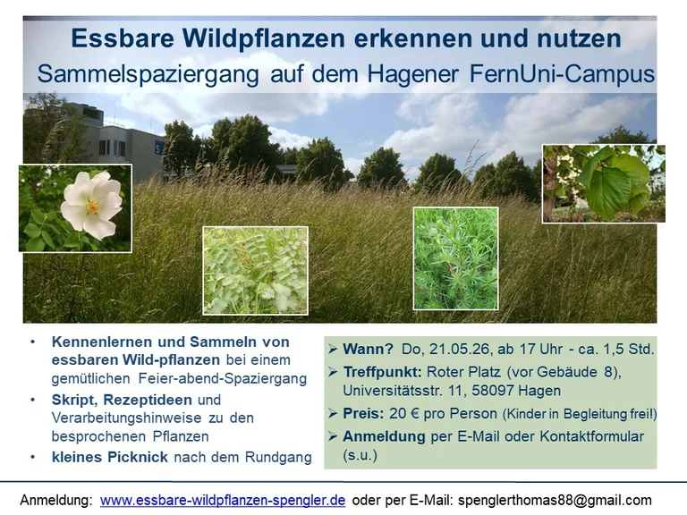 Am Do, 21. Mai 2026 startet ab 17 Uhr die Feierabend-Spaziergang-Saison auf dem FernUni-Gelände. Bei einem gemütlichen kurzen Spaziergang zeigt sich, wie viele essbare Wildpflanzen der Campus beherbergt.