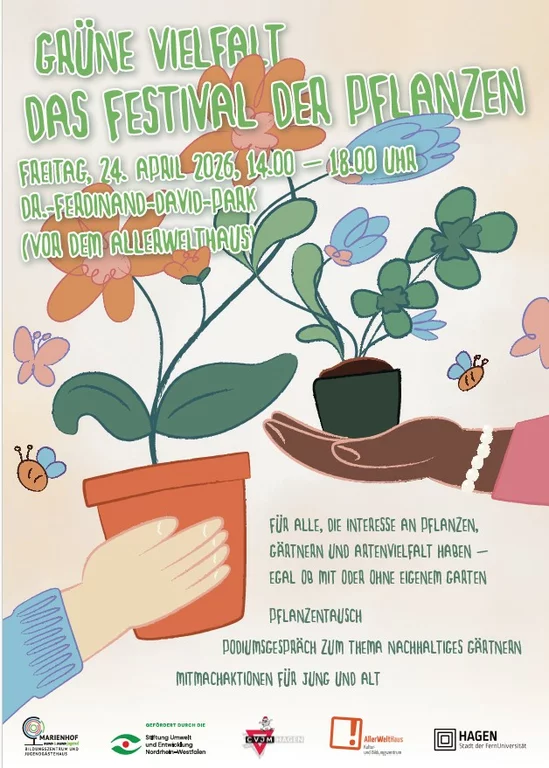 Rund um das AllerWeltHaus organisiert der Marienhof, das AllerWeltHaus und der CVJM am Freitag, 24. April 2026, von 14 bis 18 Uhr in Hagen (Westf.) wieder ein Festival der Pflanzen.